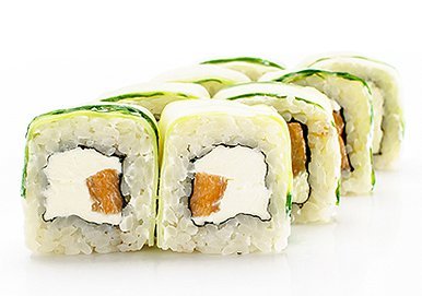 Лосось, Лук зеленый, Нори, Огурцы, Рис, Сыр сливочный, Спайси соус,